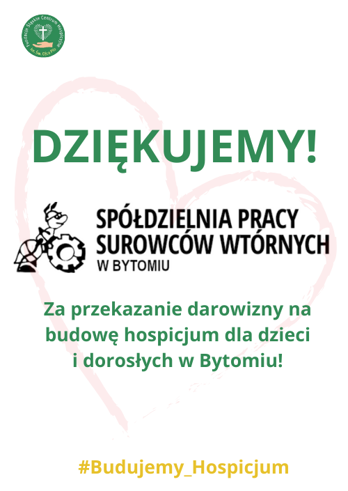 Z ogromną wdzięcznością i radością pragniemy wyrazić nasze serdeczne podziękowania Spółdzielni Pracy Surowców Wtórnych za przekazanie darowizny w wysokości 5000 zł na budowę nowoczesnego Hospicjum dla Dzieci i Dorosłych w Bytomiu.
